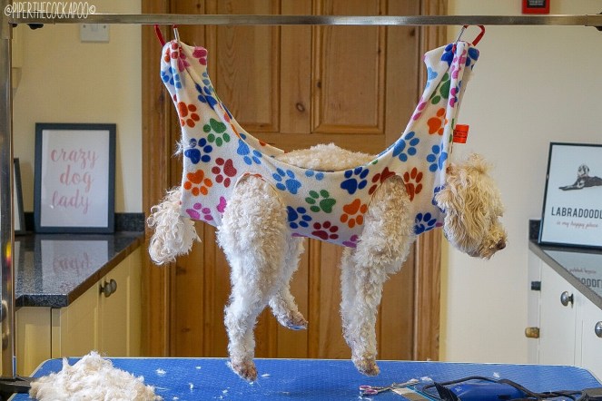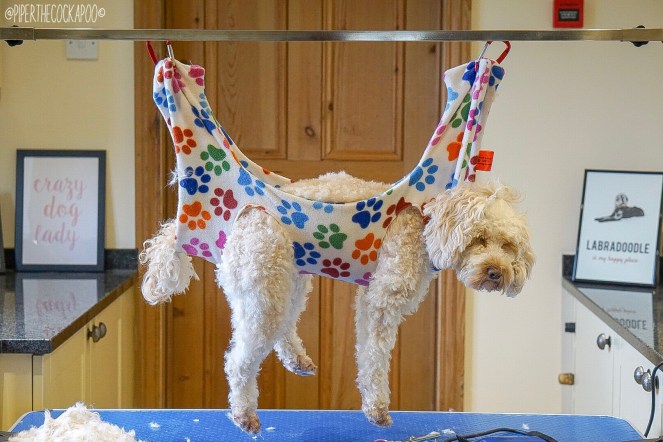 After the face, we tackle the feet. This is definitely Piper’s least favourite part. She hates having her feet touched. We use a calming cradle which has helped hugely with relaxing Piper but most importantly keeping her still. Our friends Amy & Tilly the Poodle recommended this and it really has been a life saver!